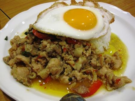 トムヤムクンと、その隣のは、何か炒められた鶏がご飯に乗っかってました。トムヤムクン美味い!すっぱいのが、なんともいえない。主食の方は、ちょっと色の設定誤ったから美味しくなさそうに見えるけど、大変美味しかったです。辛いんだけど、後引く美味さ。やめられない止まらない。
